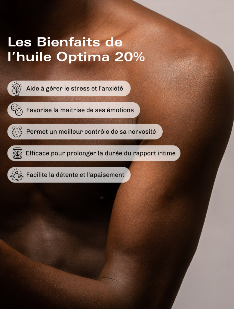 L’huile Optima 20 % lutte à la fois contre la dimension émotionnelle et mentale d’une éjaculation prématurée. En favorisant une profonde détente, elle apaise les tensions, réduit la charge mentale et dissout la peur de la contre-performance. En agissant directement sur le système endocannabinoïde, le CBD régule le niveau de stress et ouvre cet état de calme intérieur propice à un meilleur contrôle de l’orgasme