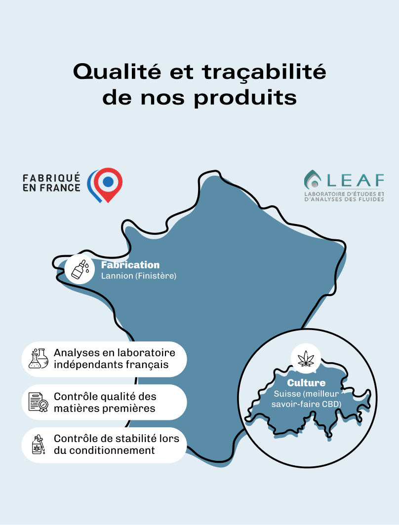 Vous devez impérativement vérifier la qualité et l’origine du chanvre. Le chanvre suisse par exemple, celui qui entre dans la composition de nos huiles, est réputé comme le plus pur et efficace.